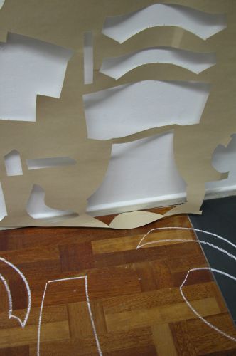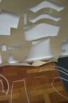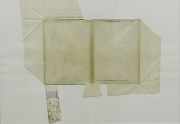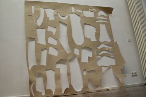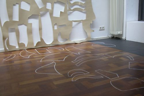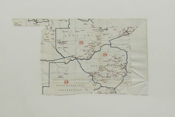 Die Arbeit „Eine Frage des Eigentums“ besteht aus Fundstücken: alte Landkarten, die territoriale Umbrüche bezeugen. Auf der Afrikakarte von ca.1910 bezeichnet eine dünne Zeichenlinie eine Grenze: Deutschostafrika. In den fünfziger Jahren wurde diese Landkarte zum Einschlagen von Chornoten verwendet und der Name einer neuen Eigentümerin sichtbar draufgeschrieben: „Frl. Wendt, Eigentum Immanuel II“. Dieser Fund wiederum wird im Galerieraum verwertet.